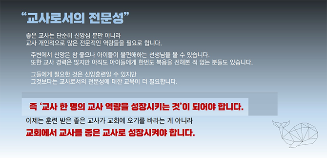 이제는 훈련 받은 좋은 교사가 교회에 오기를 바라는 게 아니라 교회에서 교사를 좋은 교사로 성장시켜야 합니다.